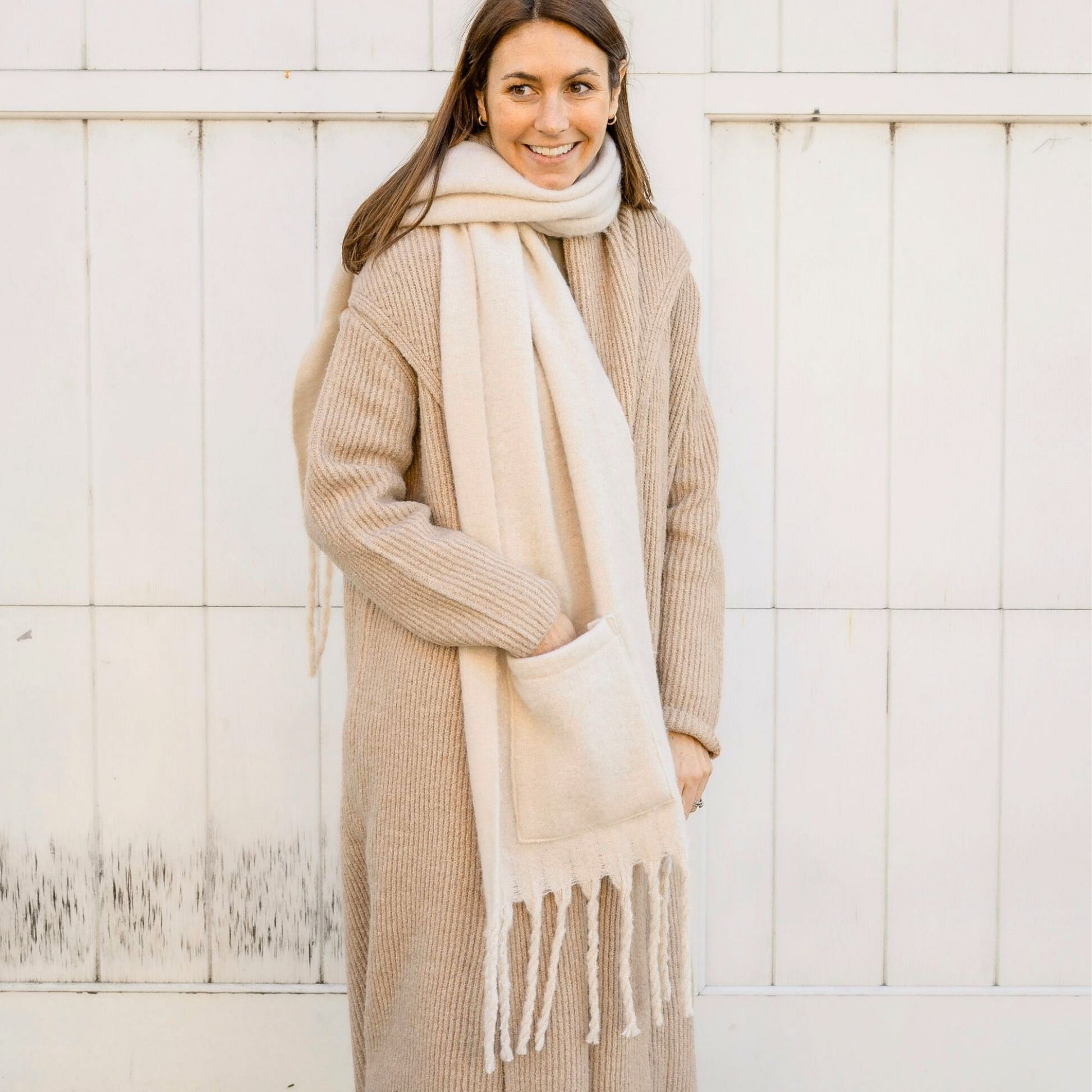 Stay warm and keep your essentials close with our Extra Long Fringe Scarf with Pockets. This stylish accessory features a super soft knit material that will keep you cozy on chilly days. The extra wide and long design provides ample coverage while the two roomy pockets allow you to securely store your phone, wallet, or other small items. This scarf transitions seamlessly from running errands to a night out with friends.