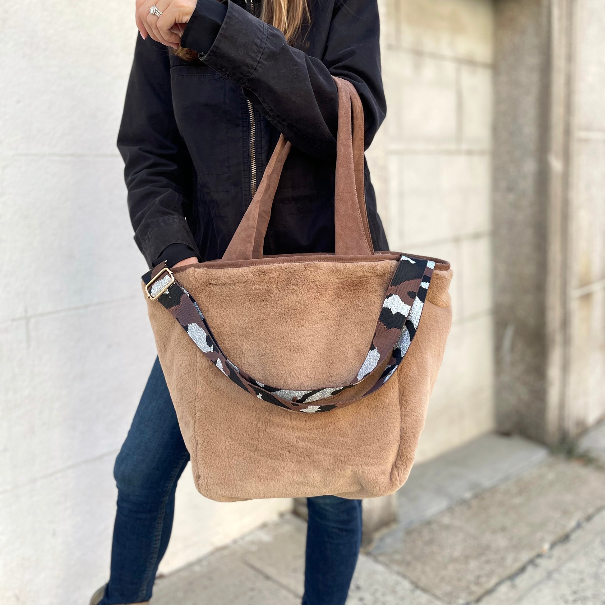 Faux Fur Tote With Removable Guitar Strap - Camel