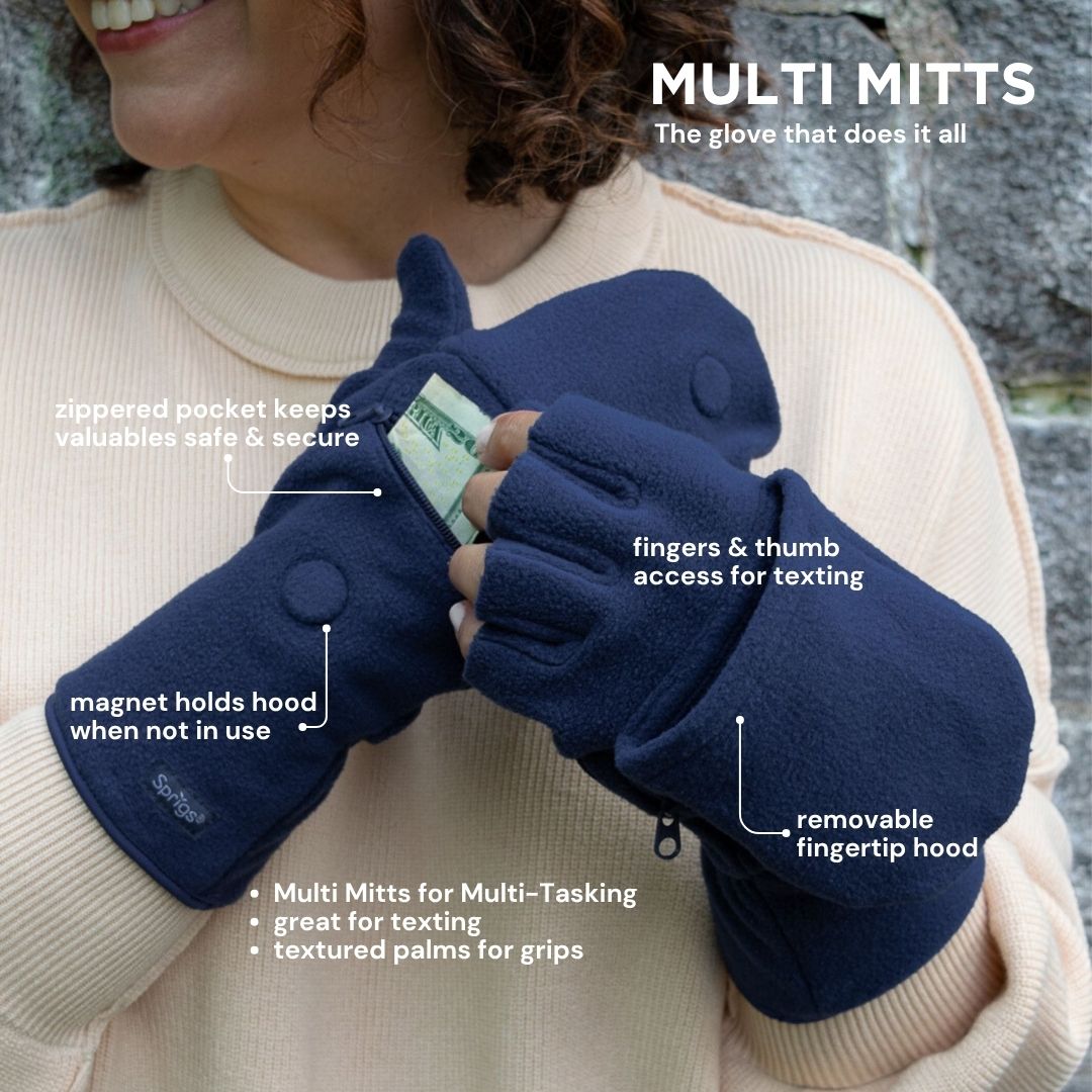 Like the coziness of a mitten but need access to your fingers? Then our Multi-Mitt fingerless gloves are for you. Designed with a magnetic stay-open flap to prevent the mitt from falling when you are using your fingers and a zipper pocket to store essentials, these mittens are as functional as they are warm.